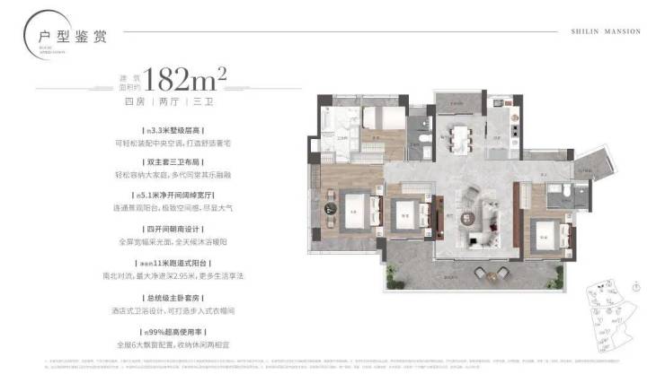 182㎡四房二厅三卫:宽敞大气的设计,特别适合对居住品质有较高要求的家庭,不仅空间开阔,而且配备了多个卫生间,提升了使用的便利性。