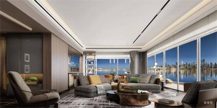 项目建筑采用现代简约格调,汲取宝格丽酒店低调典雅的风格精髓。外立面以玻璃幕墙为主,搭配简洁线条勾勒,既强化了江景视野的通透感,又呈现出沉稳的视觉效果。建筑规划充分考虑江景资源利用,多数户型采用北向望江设计,最大化呈现三江汇聚的景观优势,同时通过合理的楼栋排布,减少户型间的遮挡,保障室内采光与通风效果。