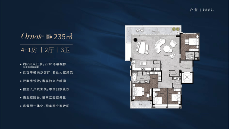 主力户型为179-235㎡全T2板式大平层,采用专梯专户设计与双入户大堂配置。以235㎡户型为例,格局方正,独立玄关提升隐私性,客餐厅无缝衔接,动线设计兼顾公共区域与私密居住空间的划分,主卧套房配备独立卫生间,面积达9.53㎡,搭配北向飘窗可直揽江景。全屋采用精装交付,配备贝克洛TOP级专利系统门窗、德系精工厨卫及多场景智慧健康生活系统,劳伦黑金石材铺陈空间,兼顾实用性与品质感。