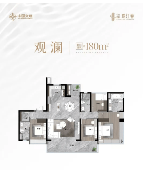 180㎡4+1 房 3 卫:高端改善户型,全南向江景视野,约 8.5 米超大景观阳台,270° 俯瞰珠江;双套房设计(主卧 + 老人房均带独立卫浴),兼顾私密性与便利性;预留独立书房或茶室空间,满足高端社交需求;适合三代同堂或对居住品质要求高的高净值家庭,改善一步到位,江景与舒适兼得。
