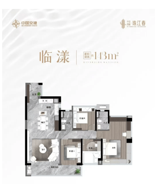 143㎡4 房 2 卫:改善爆款户型,四开间朝南,约 7.2 米宽景阳台,江景视野最大化;主卧套房带步入式衣帽间与双飘窗,居住舒适度拉满;LDK 一体化设计(客厅、餐厅、厨房连通),空间通透,适合多子女家庭;新规后超高使用率,实际居住空间远超同面积段传统户型,实用性强。