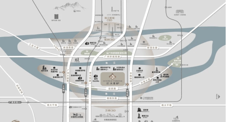项目坐落在番禺中轴岛心,毗邻珠江新城、琶洲和万博三大CBD,地段稀贵。项目所处的洛溪岛比肩二沙岛,地理优势显著,兼具江景与城市景观资源,南眺万博与灵动江景,北观金融城、珠江新城CBD。中轴岛心的稀缺性赋予项目长远投资价值,同时为居住者提供近在咫尺的城市塔尖资源,实现“城市中心+滨江奢宅”的双重体验。岛心位置不仅带来视觉上的江景开阔,也意味着生活便利与城市精粹的高度集成。