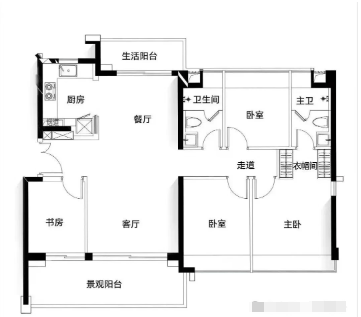 约124㎡四房PLUS版:在121㎡户型的基础上增加了北侧生活阳台,并将景观阳台延伸至书房位置,进一步提升了空间的灵活性和实用性。