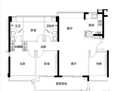 约121㎡四房户型:南北对流,四开间朝南,阳台开间达6.4米。主卧室带有衣帽间设计,卫生间干湿分离。书房可灵活用作老人房或儿童房。