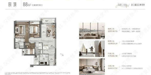 建面约88㎡「宸境」:双卫三房,南北通透,视野开阔;