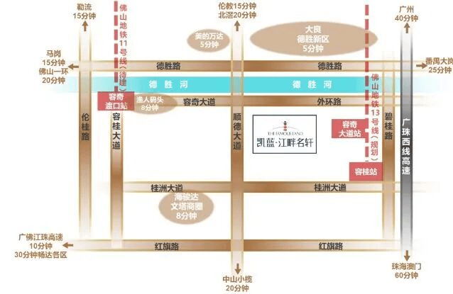 凯蓝·江畔名轩地处容桂成业路与桂洲大道交汇处,属德胜河南岸滨水发展带的核心节点。这里不仅是容桂老城区向现代化滨水新城转型的关键区域,更被纳入顺德“一河两岸”整体城市更新战略。