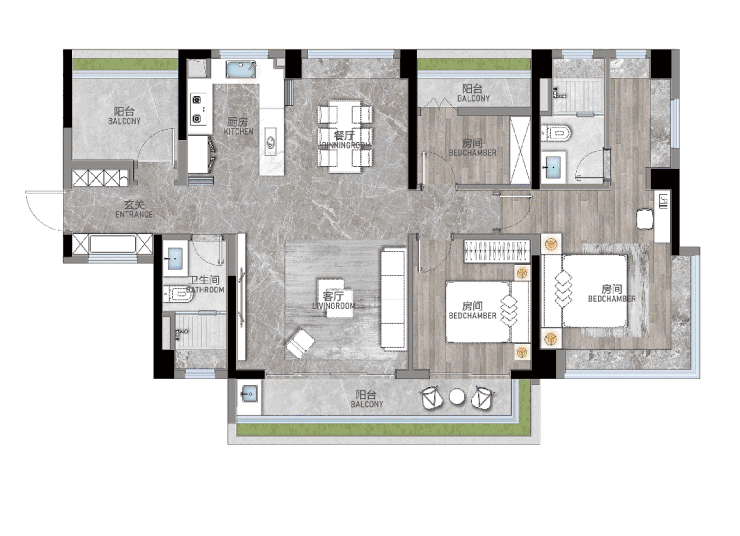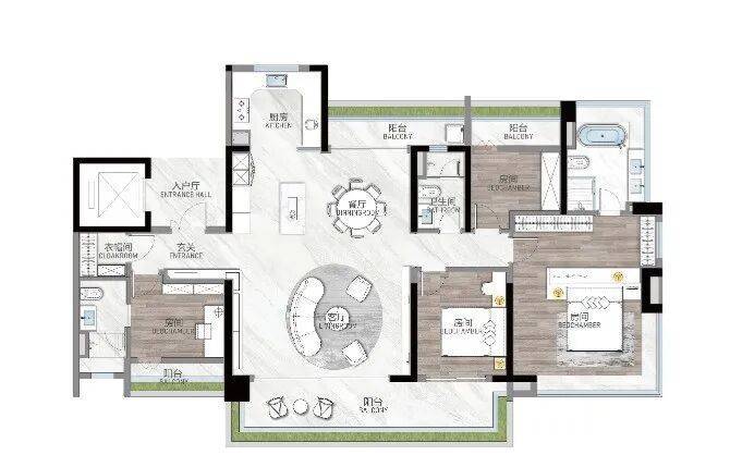 115㎡户型:设独立入户玄关与公卫,实现归家即消杀,动线科学;