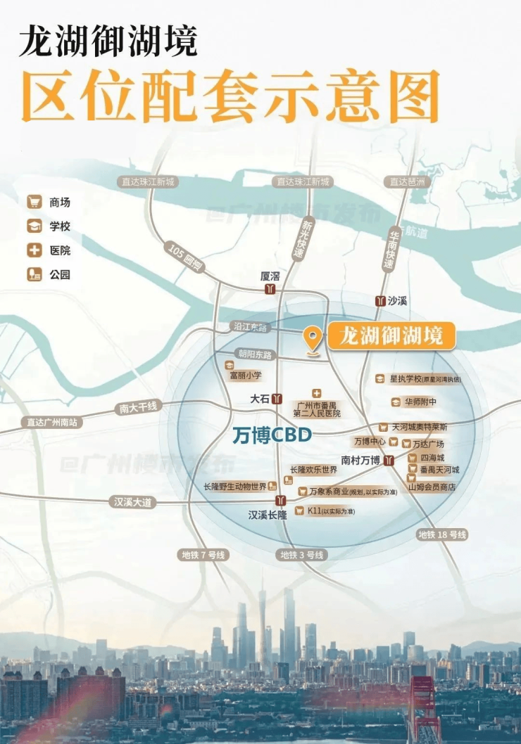 项目地处广州城市发展主轴——南中轴线上,紧邻星河湾,区位价值突出。虽距地铁3号线大石站直线约1公里,需依赖接驳车,但自驾通勤极为高效:经新光快速路10分钟直达万博CBD,15分钟抵达广州南站,20分钟通达珠江新城;同时依托华南快速、番禺大道、105国道等主干道,轻松串联琶洲、广州塔、海珠等核心板块。周边3公里内汇聚天河城、K11、四海城、华润万象系等十大旗舰商业体,商业能级比肩市中心,生活便利度与城市界面俱佳。