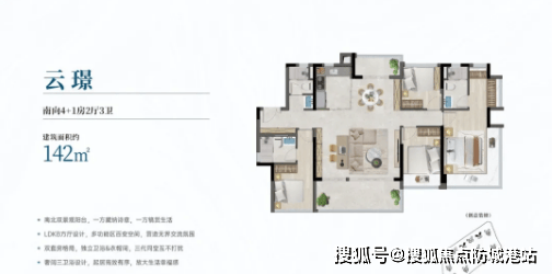答:涵盖 76-142㎡三至五房,142㎡五房双主套设计适合改善家庭,全南向高使用率,空间舒适度高。