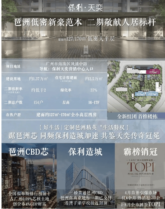 2024 年 10 月 30 日,保利以底价摘得海珠区琶洲南区三宗地,由此诞生保利天奕。作为琶洲南三兄弟之一,项目规划尽显高端品质。全是 16 - 17 层的小高层,2 梯 2 户设计,全朝南布局,楼间距近 50 米,C1 栋和 C2 栋更是组团头排楼栋,保障每户充足的采光与通风,提升居住私密性与舒适度。容积率较低,营造低密度居住环境。外立面采用豪宅标配的玻璃幕墙 + 铝板,独特的弧度设计增添线条美感,彰显现代奢华气质。