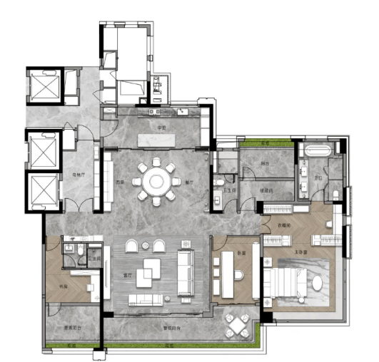 超大面积户型:如268平方米的大面积户型,3T2户设计,保姆电梯独立设置,主卧步入式衣帽间,双开门设计,增加私密性。