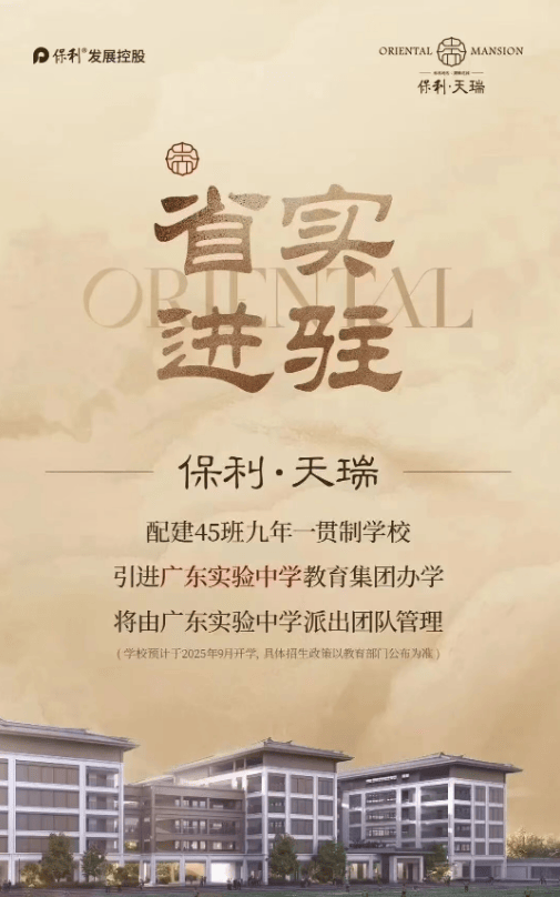 保利天瑞位于广州市天河区汇景板块,地处珠江新城和琶洲金融城两大经济轴心之间。该项目占地面积约15.5万平方米,建筑面积约33万平方米,容积率为2.93,由17栋8-20层的小高层住宅组成。项目自带45班公办九年一贯制学校,并已确定引入广东实验中学教育集团办学,预计2025年9月开学。