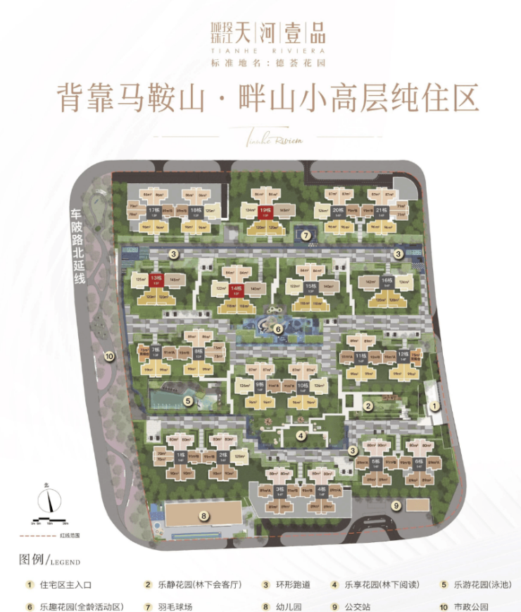 社区内设有全龄式社区乐园,构建了三环五园沉浸式园林,配有双泳池设计,满足不同人群的需求。紧邻项目的马鞍山未来规划为天河智谷人才公园,面积超过83万平方米,将成为区域内重要的休闲娱乐场所。