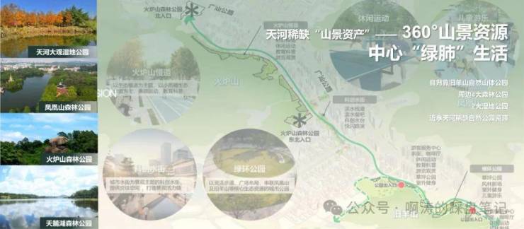 项目最独特的生态优势,是天河难得的三大自然山体公园环绕 —— 火炉山森林公园、凤凰山森林公园、天麓湖森林公园,三大公园总面积超 10000 亩,森林覆盖率超 90%,负氧离子浓度远超市区,是天然的 “城市氧吧”。