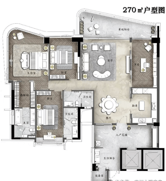 A户型:王牌户型,270㎡环幕江景四房,配备约9米超大阳台,一线望江无遮挡。