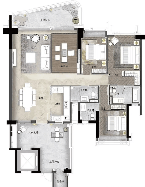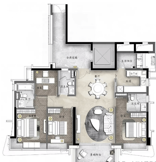 C户型:约140㎡南向园景大宅,超高性价比,三卧室朝南设计,阔绰双主套房。