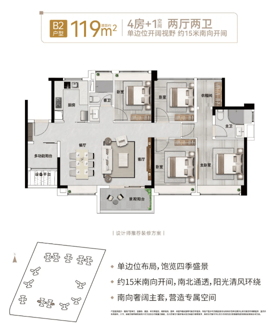 119㎡4+1房采用经典竖厅设计,南向三开间采光,空间布局合理,动静分区清晰。主卧配备步入式衣帽间,满足主人的收纳需求与居住质感,其余房间尺寸适中,可满足老人同住或孩子独立居住的需求。对于想“卖小换大”的置换家庭来说,该户型总价友好,无需承担过高成本,就能实现天河主城的换房梦想,同时享受成熟社区的配套优势。