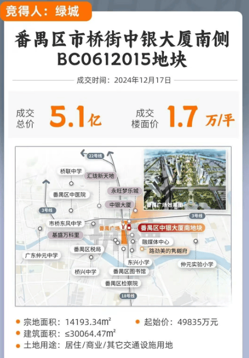 2024年12月17日,绿城以5.08亿元的价格成功拿下广州番禺广场中银南侧地块,楼面价达到1.7万元/平方米。这一地块被命名为“绿城玉海棠”,预计在春节后正式推出市场。地处发展超过25年的番禺广场核心区域,这里不仅是番禺区的行政中心,还拥有丰富的商业和教育资源。未来,随着番禺广场TOD项目的建设推进,该区域将迎来更多的发展机遇。