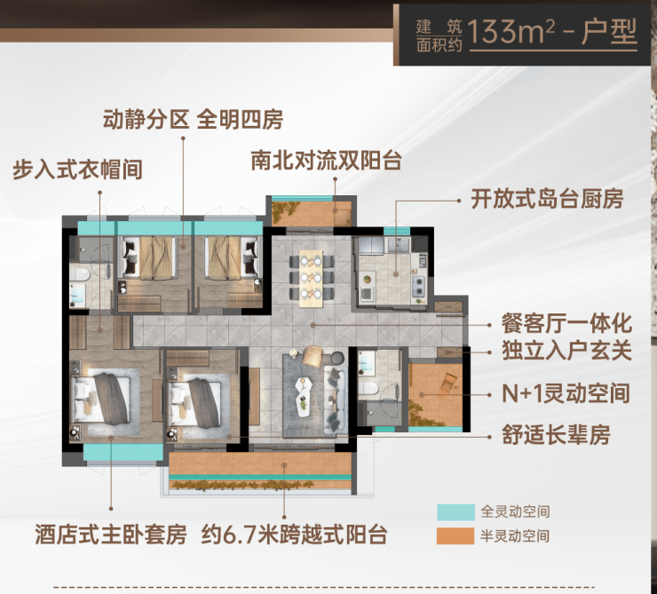 133平方米4+1房:四开间朝南,南北双阳台对流设计,中西厨岛台,配备约6.7米超大阳台,主卧配有步入式衣柜,是市区绝版完美的五房户型。