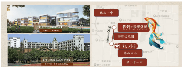 A:配建18班幼儿园(引入机关一幼),周边有佛山六小、九小鲤鱼沙公办学校(建设中),初中有佛山十一中,高中有佛山一中。