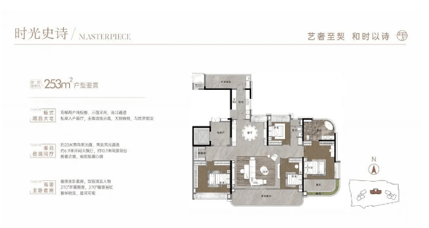 户型设计是都荟天珺的另一大亮点。全盘仅五种户型,均为改善型大平层,其中253㎡四房两厅两卫户型尤为瞩目:南北通透,10米超长阳台贯通客厅与次卧,主卧与主卫均采用270°弧形飘窗,实现无界观景与极致采光。所有户型标配双阳台、大面宽、专梯专户(楼王单位),196㎡户型更创新设置双主卧套间。项目特邀LWK+PARTNERS、AECOM、梁志天设计集团三大国际团队操刀,从建筑立面到室内细节,大量运用弧形元素与原木色调,营造出如爱马仕般低调奢华的空间氛围,堪称“行走的艺术品”。
