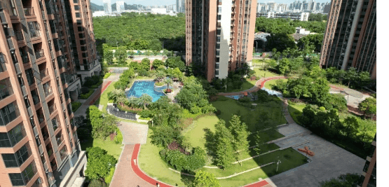 珠江花城占地广阔,其中约10万平方米被规划为围合式大园林,采用“两轴、三环、四大剧场、六大花园”的布局方式,营造出一片绿意盎然的生活空间。园区内设有多功能草坪、蔚蓝泳池、全龄游乐园等设施,满足了不同年龄段居民的需求。特别是五六期园林,南北楼间距达到了约140米,东西楼间距约为145米,保证了视野的开阔性和居住的私密性,让每一位住户都能享受到自然的美好与宁静。