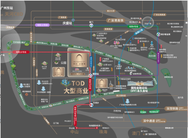 交通脉络决定居住便捷度与区域通达性,湾区金融城构建地上地下一体化多维交通网络,以地铁为核心、主干道为骨架,实现畅达广州全城与粤港澳大湾区核心城市的高效出行。轨道交通层面,项目紧邻广州地铁18号线横沥站,步行距离仅约80米,18号线作为湾区高速地铁,时速达160km/h,可快速串联珠江新城、琶洲、万博等广州核心CBD,未来还将延伸至中山、珠海等大湾区城市,实现跨城快速通勤,无论是日常上班、商务出行还是休闲游玩,均可高效抵达目的地。道路交通层面,项目周边形成四横四纵主干道路网,横向衔接南沙核心主干道,纵向连通凤凰大桥、南沙大道等重要交通要道,自驾出行可快速抵达南沙各板块及广州主城区,全程路况通畅,无拥堵困扰。公共交通配套完善,项目周边分布多条公交线路,覆盖南沙区内主要商圈、医院、学校等场所,满足业主多样化出行需求。整体交通体系兼具速度与便捷性,以TOD核心住区的优势,打破空间距离限制,让业主出行高效无忧,同时依托完善交通网络,进一步提升项目区域价值与居住便利性,成为大湾区核心交通枢纽旁的品质住区典范。