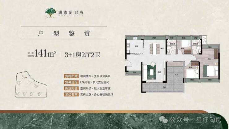 · 建面约141㎡奢阔四房:约7米超宽景观阳台,东、南、北三面飘窗,360°采光观景,主卧套房设计,专为城市高阶定制 。