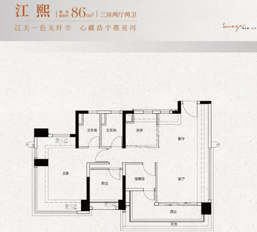 86㎡:三房两厅两卫,南向观景大阳台,主卧带270°飘窗。