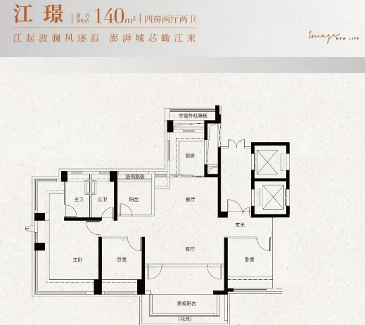 140㎡:大四房两厅两卫,北向一线望江,稀缺板楼设计,专梯专户。