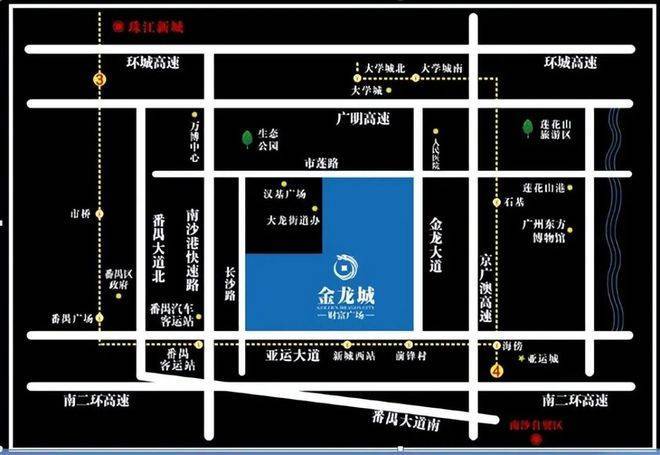 金龙城·峰汇位于广州城市格局的全新核心地带,坐拥亚运大道与市莲路两条城市主干脉,交通脉络纵横交织,形成连接广州南北的重要走廊。从项目出发,驱车即可畅达南沙港快速与广澳高速双出口,北向可直抵万博商圈、琶洲会展区与天河CBD,南向无缝接驳南沙自贸区,西连市桥繁华中心,东靠莲花山景区,地理位置可谓四通八达、承上启下,既拥有国际化商务圈的高效通达,也坐享南广州城市群的生活便利。这里不仅是交通枢纽,更是城市发展战略的黄金点位,占据广州未来城市升级的重要轴心。