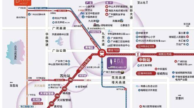项目距离 21 号线中新地铁站口约 1.8 公里,步行不太现实,骑电动车较为方便。从这里坐地铁 1 站可到镇龙 TOD,快线 3 站就能到天河,还能不出站换乘 14 号、4 号、6 号线,便捷直达城市各处。距离新白广轨道永宁北站直线距离约 6 公里,2 站可通达科学城、新塘 TOD,3 站到东莞,7 站到白云机场,13 站到深圳,畅享湾区生活圈。此外,花莞高速和增天高速(在建)构建了四纵六横的立体路网,离花莞高速中新南出入口直线距离仅 2 公里,出门即可上高速,快速直达天河 CBD。项目直线距离约 3 公里处规划的增天高速预计 2025 年开通,届时到天河将更为便捷。