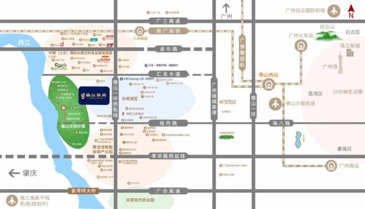 广域西江华府落子佛山市三水区白坭镇,这里是佛北战新产业园的重要组成部分,也是三水区重点发展的新型城镇化与文旅融合区域。项目地处白坭新城区核心位置,北靠中国(三水)国际水都饮料食品基地南园,南接聚龙湾智能装备产业园,西临佛山文创古镇,东邻白坭新城区,地理位置得天独厚。