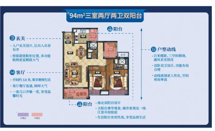 94㎡三房两厅两卫:空间更宽裕,二胎家庭亦从容;