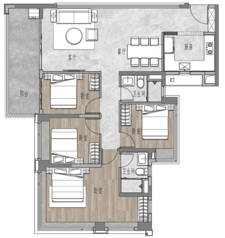 85㎡四房两厅两卫:四开间朝南,采光通风极佳;主卧带独立卫浴和衣帽间,私密性强;赠送约 8㎡设备平台,可改造为书房或儿童房,进一步提升空间利用率。