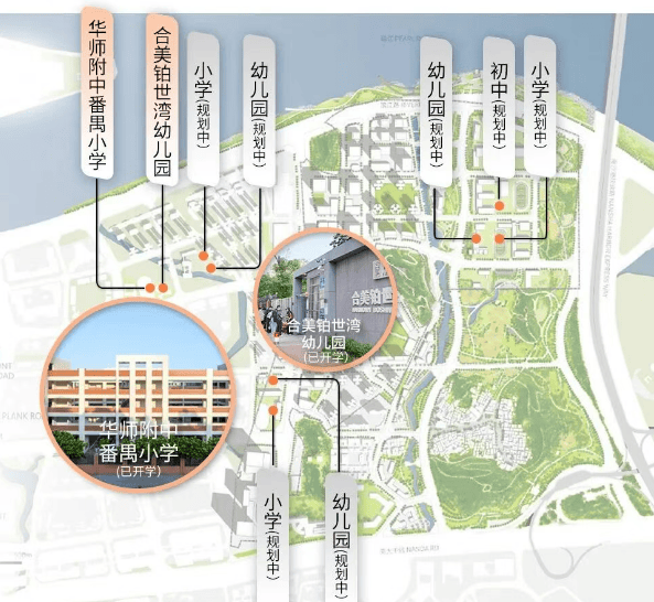 项目内部规划了9所中小幼学校,其中包括已开学的华师附中番禺小学(24班制)和合美铂世湾幼儿园(12班制)。初中方面,虽然目前没有特别突出的公立初中,但珠江万博城正在配建新的初中,未来有望提供更优质的教育选择。周边还有一所私立的星执中学(原名执信中学)可供选择。