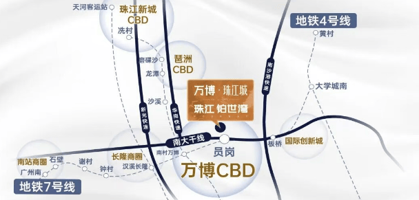 珠江万博城靠近地铁7号线员岗站,步行仅需约550米。从这里出发,一站即可到达南村万博站(7号线与18号线交汇),四站可达琶洲,五站可到珠江新城。驾车方面,距离南大干线仅500米,5分钟车程内即可抵达万博CBD;经南沙港快速路、新光快速路等主要干道,10分钟可达大学城,15分钟可达琶洲,20分钟可达珠江新城,25分钟可达南沙自贸区。