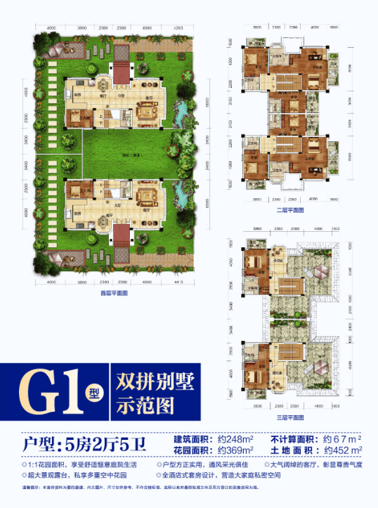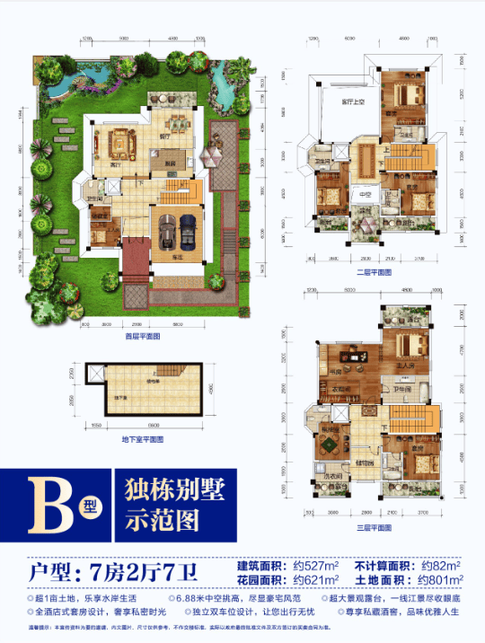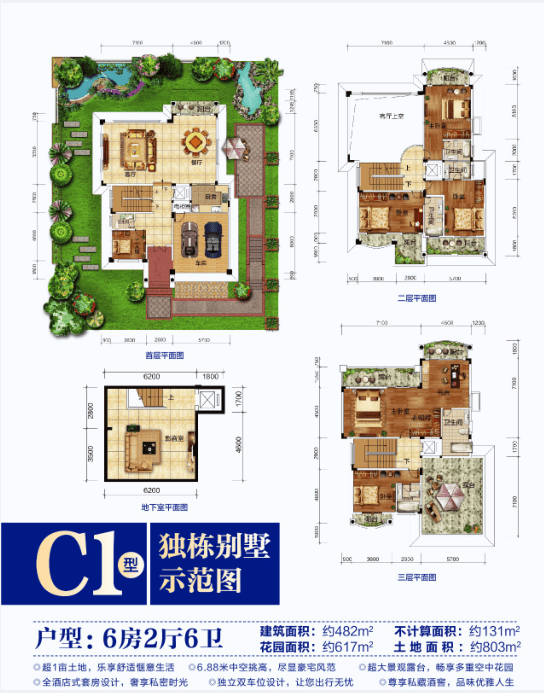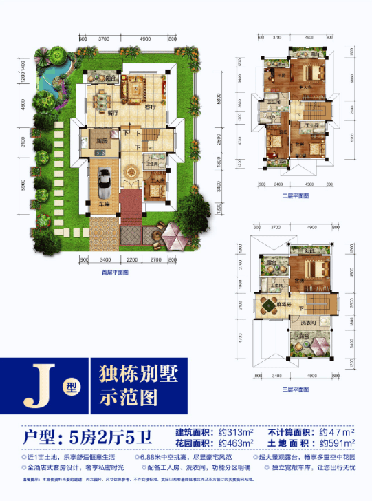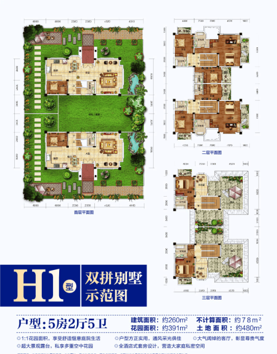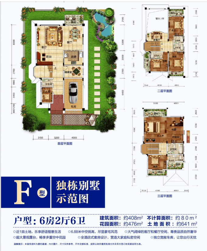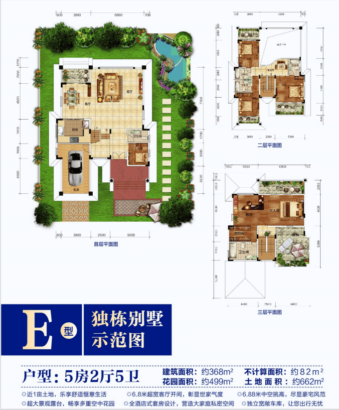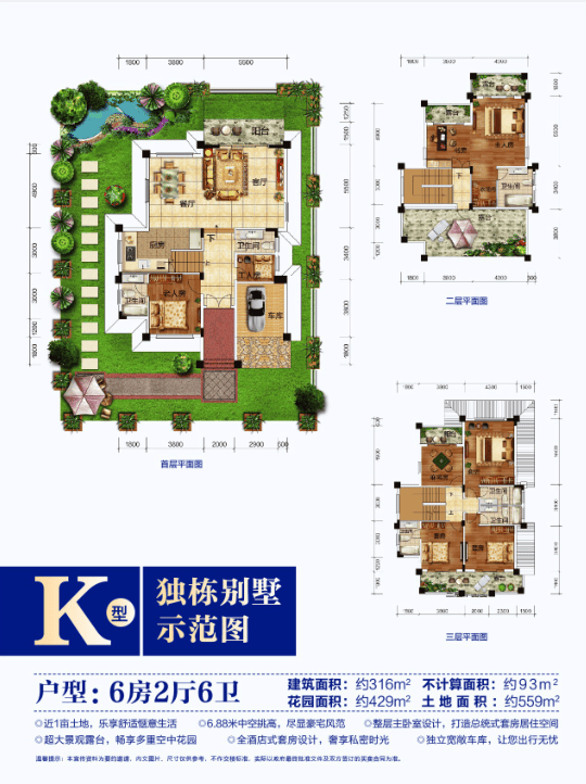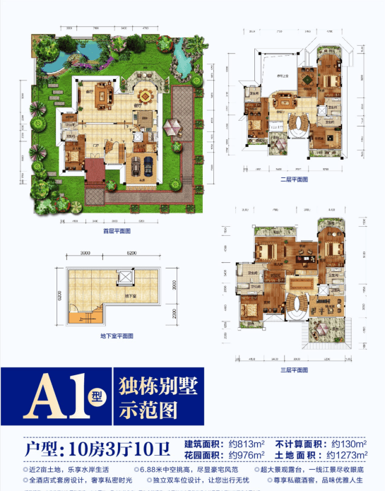独立别墅:建面约260–813㎡,户户独门独院,配备私家车库、6.88米挑高客厅、空中花园及大面积赠送花园(比例约1:1)。欧陆式建筑风格庄重典雅,空间尺度足以容纳多代同堂,亦可作为家族资产代际传承。