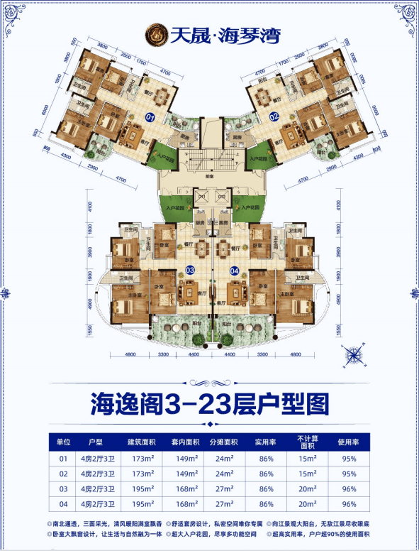 江景洋房:建面约145–196㎡,部分带装修,户户配有入户花园与超大景观阳台,使用率超90%。大平层格局兼顾视野与功能,适合追求江景视野但偏好高层便利性的家庭。