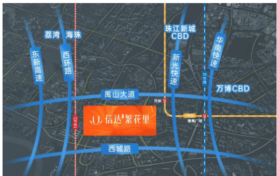 自驾出行同样便捷,项目临近禺山大道、西环路两大主干道,通过禺山大道可快速接驳东新高速,直达荔湾、海珠等区域;经由西环路对接新光快速,转瞬即可抵达万博CBD、珠江新城CBD等核心商圈,轻松融入广州主城生活圈。