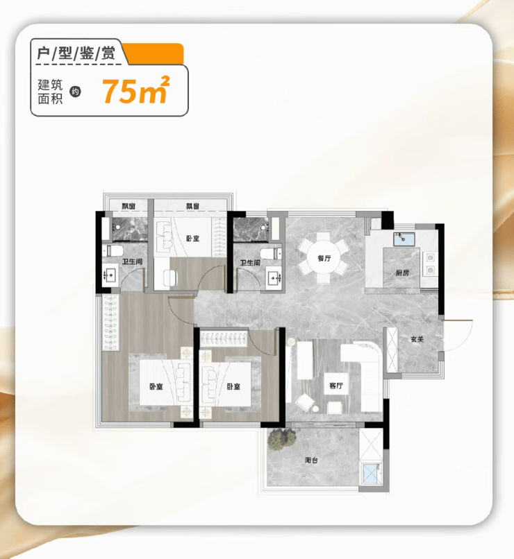 建面约75㎡三房户型,凭借超高实用率直接超越同面积竞品,成为刚需家庭的首选。该户型配备独立玄关,可改做储藏室,收纳空间爆棚,轻松解决家庭杂物收纳难题。南北对流的设计让整个空间通透明亮,空气流通性极佳,有效提升居住舒适度。厨房采用主流的U型设计,在相同的面积内,台面空间更大,操作动线更合理,足够容纳两人同时操作,为家庭烹饪增添乐趣。奢华主套设计,同时享有独立卫浴,拥有270°环幕视野,瞰景采光一流,推窗即可欣赏社区美景,让居住心情更明媚。