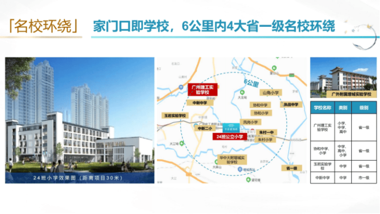 项目教育资源得天独厚,打造全龄段一站式教育体系,真正实现 “目送式教育”,彻底解决家长的教育后顾之忧。项目南侧一路之隔规划 24 班公立小学,目前已进入建设阶段,建成后业主子女可步行入学,安全便捷。同时,项目受广州科教城直接辐射,科教城规划新增7 所小学、3 所中学、1 所九年一贯制学校,未来将形成密集的优质教育矩阵,学位资源充足。周边现有朱村街凤秀小学、乌石小学、中新镇莲塘小学等多所公办学校,办学规范、师资优良。此外,项目约 200 米处有华南师范大学附属汇政双语学校,提供从幼儿园到高中的国际化教育,满足不同家庭的教育需求。从启蒙教育到中学教育,优质学府环伺,为孩子成长保驾护航。
