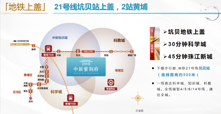 项目地理位置优越,位于增城区中新板块核心,地处知识城、科教城、科学城三城交汇之处,坐拥千亿产业集群与百亿旧改红利,区域发展潜力巨大。中新板块作为广州东部承接主城需求外溢的核心区域,楼市活跃度持续攀升,2025 年 11 月板块均价约15111 元 /㎡,市场竞争力强劲。项目紧邻广州地铁 21 号线坑贝站,步行距离仅约500 米,是名副其实的地铁上盖物业。同时,项目享受镇龙、新塘双 TOD 枢纽加持,穗莞深、新白广等多条城轨、高铁在此交汇,形成9 轨联动的超级交通网络。项目既享生态宜居的静谧环境,又拥通达全城的便捷交通,完美实现 “离尘不离城” 的理想居住状态,无论是自住还是投资,均具备极高价值。