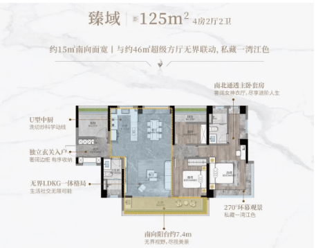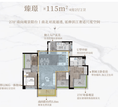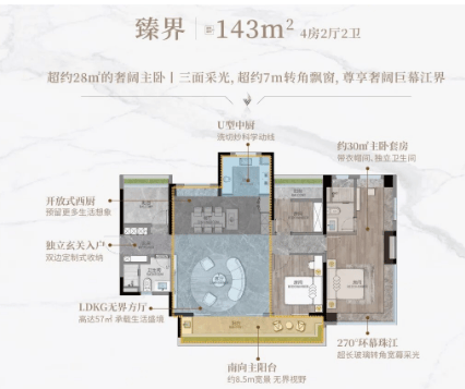 小区 6 栋住宅采用合围式设计,有 2 梯 4 户和 3 梯 3 户两种设计。目前在售 1 - 2 - 3 - 5 - 6 栋,2025 年 12 月交楼,均为 115㎡、125㎡、143㎡、190㎡全四房产品,格局方正,使用率约 100%,LDKG 大方厅设计,配备国际品牌奢装,270° 主卧环幕观景,引领新一代豪宅典范。