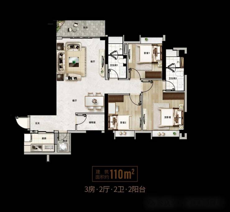 建面约110㎡三房户型:该户型为刚改优选户型,得房率约83%,采用N+1房设计,可根据家庭需求灵活改造,空间利用率极高。客厅宽敞明亮,连接超大阳台,采光通风俱佳;主卧带有独立卫生间,保障私密性;次卧大小适中,可作为儿童房或书房,适配三口之家或四口之家的居住需求。