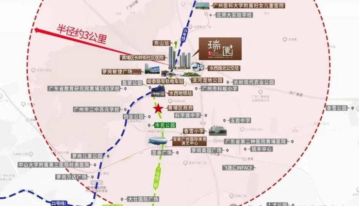 核心商业圈:实测项目3公里范围内,有萝岗万达广场、锐丰中心、萝岗奥园广场等多个大型商业中心,其中萝岗万达广场步行20分钟可达,驱车5分钟可达,商业业态丰富,涵盖大型超市、品牌专柜、影院、亲子乐园等,满足业主全方位的消费需求。