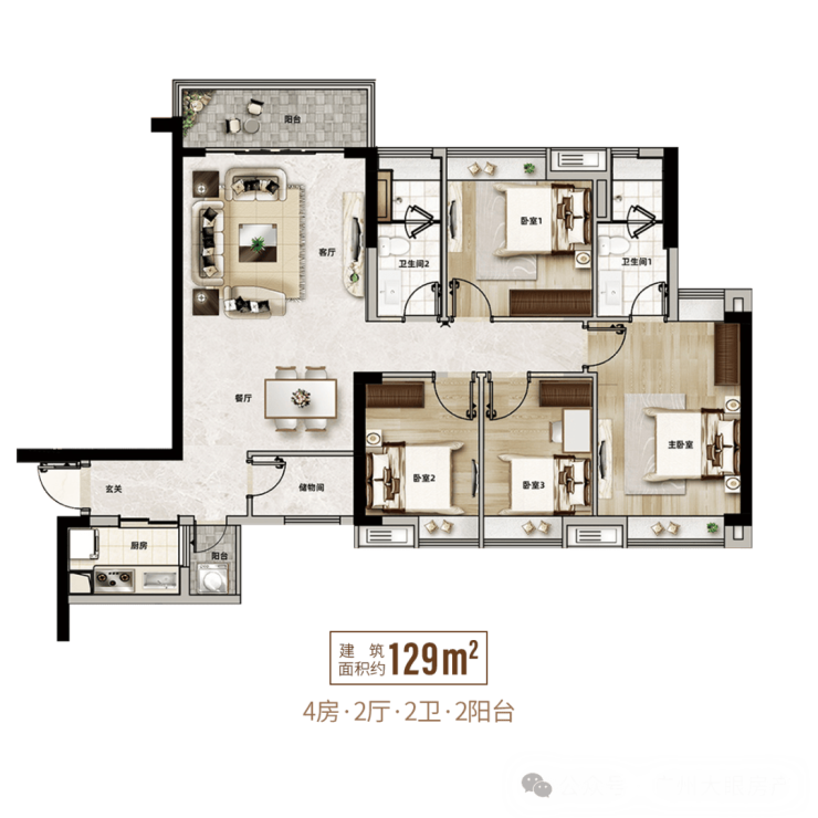 建面约129㎡四房户型:该户型为改善型户型,得房率约85%,四房设计,空间宽敞舒适,适配大家庭居住。客厅、餐厅相连,拓展室内空间,同时连接超大阳台,视野开阔;四个卧室均带有飘窗,主卧带有独立卫生间和衣帽间,私密性强;动静分区明确,休息区与活动区分离,居住舒适度极高,适合改善型人群。