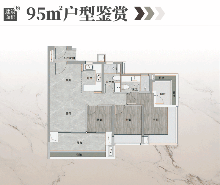 建面约95㎡舒适三房:采用经典的动静分区设计,客厅、餐厅、厨房等活动区与卧室休息区分离,互不干扰。全屋采光面总长约19米,保证了室内明亮通透。这是一个各方面表现非常均衡的户型,适合对居住舒适度有更高要求的家庭。