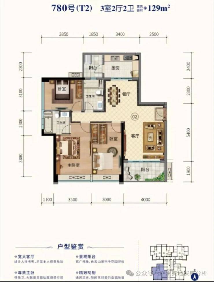127平方米的三房两厅两卫户型则更加偏向改善型需求。南北通透的设计,确保了室内采光和通风的良好效果。主卧套房设计,包含了衣帽间和独立卫浴,就像一个私密的小天地。客厅连接大阳台,视野开阔,采光充足。餐厅位置居中,方便全家就餐。厨房采用了U型或L型设计,操作动线合理,做饭效率更高。
