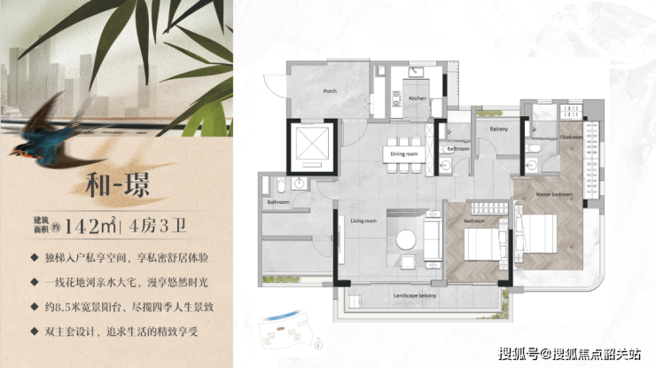 142㎡四房三卫:楼王单位,专梯入户,双主卧套房,总价约780万起。